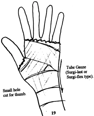 Spaces in palm bandaging will be covered by criss/cross bandaging of web spaces.