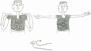 Because clothing frequently causes blisters and dressings are difficult to keep in place, children often avoid reaching with their arms above their heads as it pulls or clothes rub. This can lead to permanent tightness. These exercises are to be encouraged when reduced movement is first noticed. Lift arms out to side up to shoulder level and then to ears and lower.